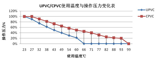 本表系以常溫73℉(23℃)時(shí),UPVC/CPVC管道之使用操作壓力為100%,隨著溫度的升高,其操作壓力殘余的百分比。